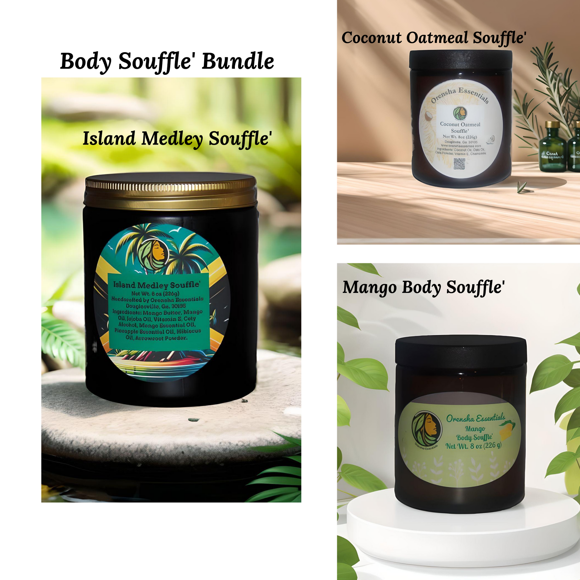 This body souffle bundle includes three luxurious scents: Coconut Oatmeal, Mango, and Island Medley. Immerse yourself in the sensual feel of coconut, mango, and a blend of flowers and fruits. Made with organic ingredients, these souffles hydrate and nourish your skin without any harmful chemicals. Indulge in a good scent while reaping the benefits of healthy, glowing skin.